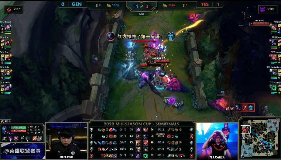 [10:23] 挖掘机利用凯南回家补充状态的节点,上路直接释放峡谷先锋,配合佐伊和杰斯推掉上路一塔,TES拿下一血塔。