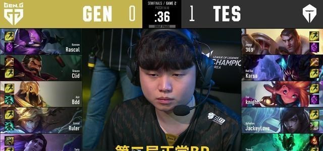TES战队:上单369杰斯、打野Kars挖掘机、中单Knight佐伊、下路阿水厄斐琉斯、辅助预言家锤石;GEN战队:上单Rascal凯南、打野Clid男枪、中单BDD沙皇、下路Ruler伊泽、辅助Life宝石。