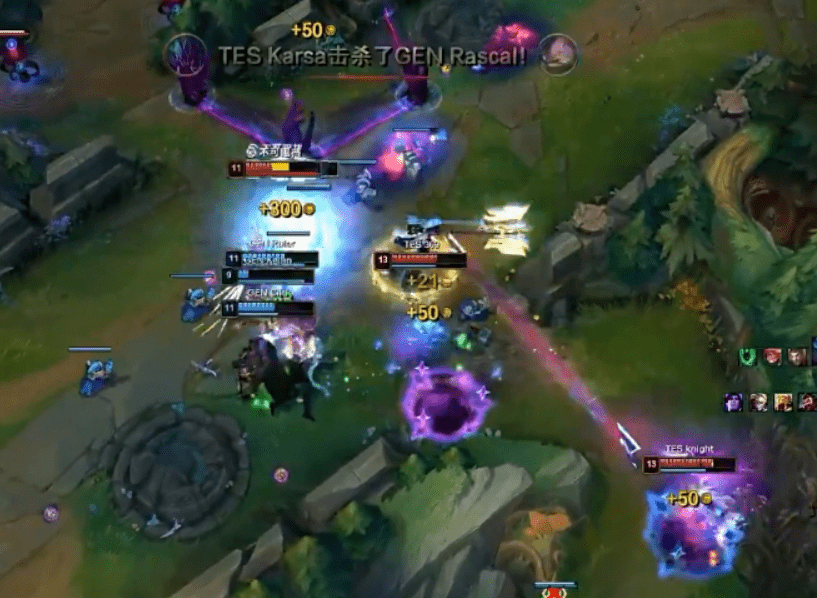 13分钟,卡萨挖掘机于草丛中耐心等待,果断闪现一套带走发育平稳的沙皇,随后369灵性TP下路,卡萨赶到瞬间形成4打3,GEN三人阵亡,前期下路的优势荡然无存。2分钟后,下路晃荡的尺帝再次被前来gank的左手击杀。