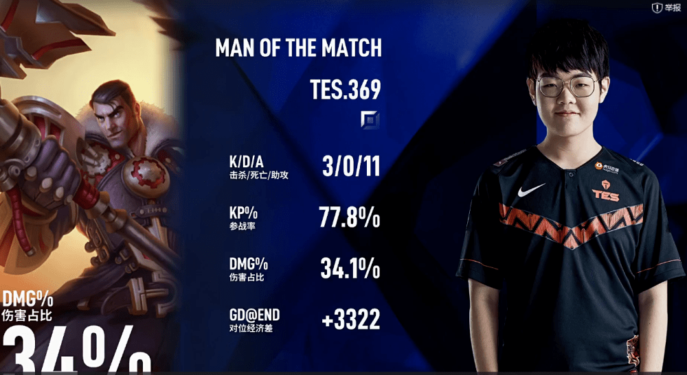 第二场用时仅比第一场多一分钟,TES前期的进攻节奏依旧强势,369延续了第一场的上佳状态,继续强势carry,再次获得MVP;而卡萨更是无处不在,不仅爆了对面野区,也在关键时候断了GEN节奏,下路虽然对线失误也在团战中打了回来。
