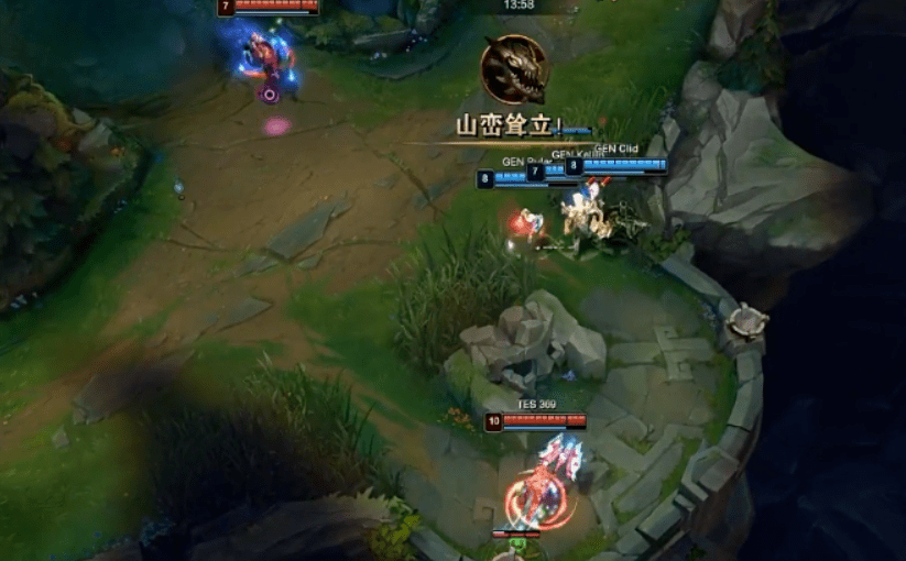 开局双方正常对线,下路对拼不过,JKL交出一血,ruler亮出图标,估计是想一吐第一句被打穿的怨气。七分钟上路迎来高潮,刚击杀失败状态不佳的369面对凯南和男枪的gank,冷静反打,帮助赶来的卡萨拿下两个头。