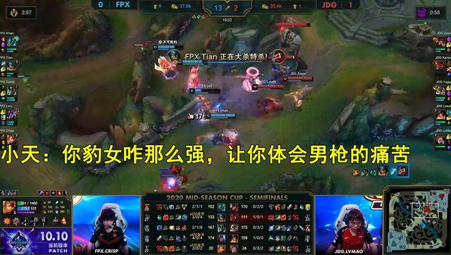 拿到巨大优势的FPX战队,在中路是被JDG战队进行了一波反打,LWX的韦鲁斯走位太激进,被瑟提给控到,交的闪现又撞到了飞机的W技能,这就使得LWX被JDg给击杀,失去了C位的FPX,缺少输出的情况下,只有小天和Khan给跑了,随后JDg战队利用这波想打大龙,FPX的Khan站了出来,TP下去后先E再大击杀了JDG两人,随后全身而退,这波是七进七出!