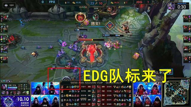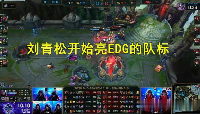 在不断的拉扯中,FPx拿到了大龙,拿到大龙Buff的FPX战队是多人进行分推,利用兵线的进行拉扯,然后推掉中路的水晶,上下两条路再被推掉,随后FPX决定直接开团,开到了瑟提后直接秒掉,由于后排和少人原因,FPX是成功的打赢了这波团战,在经历了拉扯猴子后,FPx成功的推掉了JDG战队的基地,把局势给打成了平分,这时候,刘青松直接把EDG的队标亮出来,暗示内战我在行!