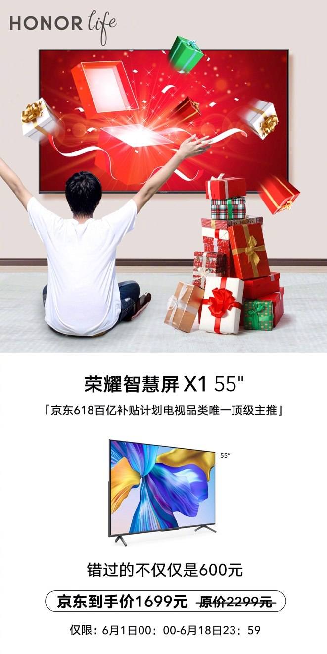荣耀智慧屏X1自上市发售以来,一直都没有让消费者失望过,临近618年中大促,荣耀也温情回馈消费者的喜爱,参与京东618百亿补贴计划,55英寸直降600元,6月1日-6月18日 1699元就可以购买。如此丰厚的活动,小伙伴们可以参与一番。游戏网
