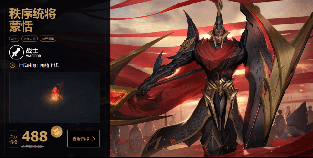 最后S19赛季末的即将上线的一位新英雄-蒙恬。蒙恬的技能具有双形态,可玩性很高,创新性很强,大家可以期待一下。也许很多玩家会指抄袭LOL的沙皇,但只有真正玩过,就会对蒙恬眼前一亮。蒙恬的售价是688点券,18888金币,要求比较高,没有金币的玩家也可以用68碎片兑换。游戏网
