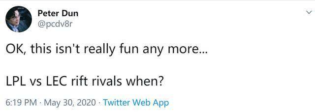 有趣的是,季中杯成为LPL赛区的内战,欧洲赛区则是成为了吃瓜群众,甚至欧洲赛区教练Peter Dun发文感慨:一点都不好玩,啥时候LPL和LEC来场比赛呢?