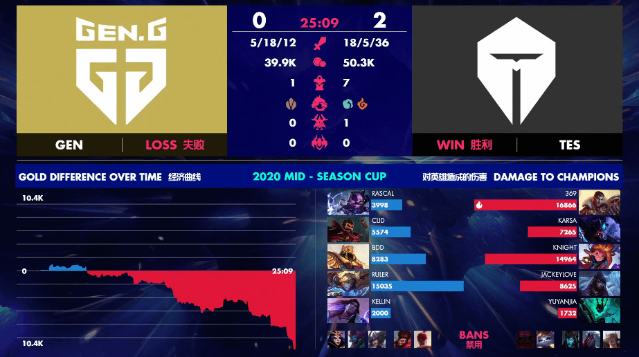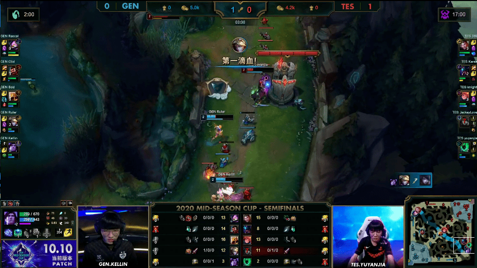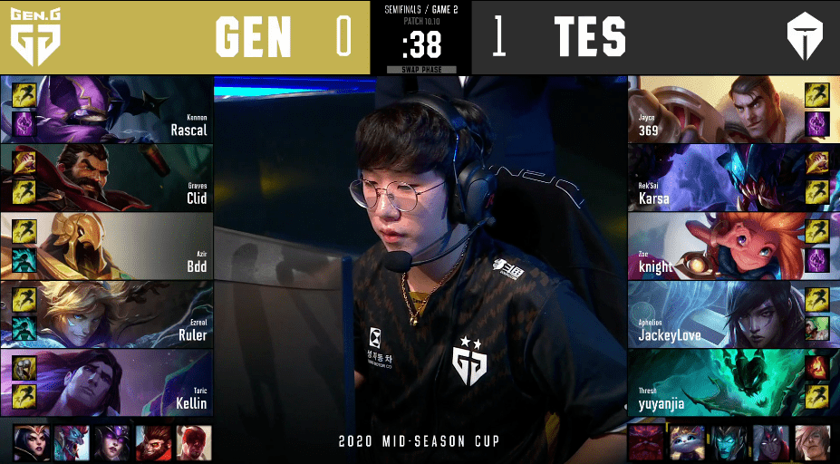 2020英雄联盟季中杯半决赛由TES对战GEN的比赛来到了第二场。在首场对局中TES以摧枯拉朽之势战胜了GEN。