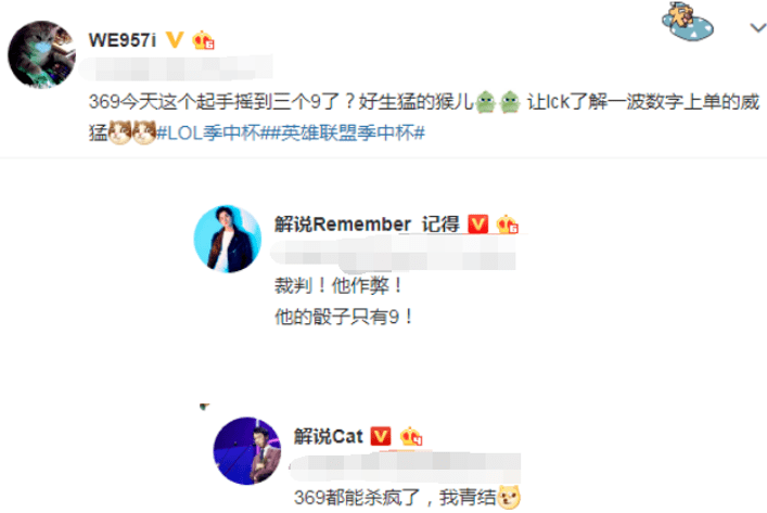 赛前369还因为自己糟糕的表现被网友称为季中杯最差上单,然而在对战GENG的比赛中,369却变成了“999”。不少解说都高度评价369在比赛中的表现。解说975、记得和Cat三人都觉得369太强了,几乎完爆了他的对手。