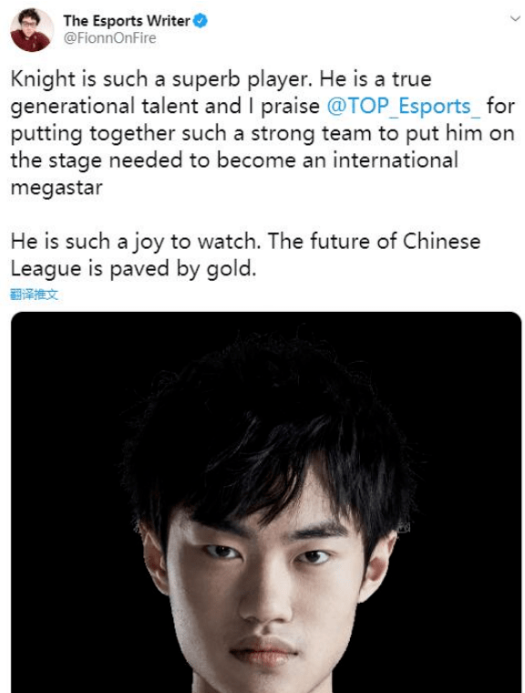 TES击败了T1,又零封了GENG。不少网友都觉得Knight功不可没,他的辛德拉、妖姬、佐伊和艾克几乎都打出了不少高光时刻。团战前期对线无压力,即使后期团战也可以找到战队的突破口。不少国外网友都对Knight称赞不断,就连ESPN记者都发表了自己的看法。他还表示:“ Knight是如此出色的选手,他是真正的新一代天才选手。”