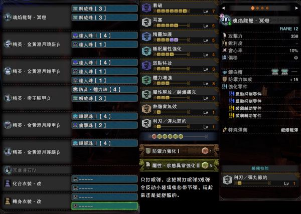 这套配出来就别想伤害的事情了,连个炮术都没有,不过控制还行,古龙3眠3麻没问题,配合榴弹陷阱衣装之类的打普通怪应该能控很长时间。