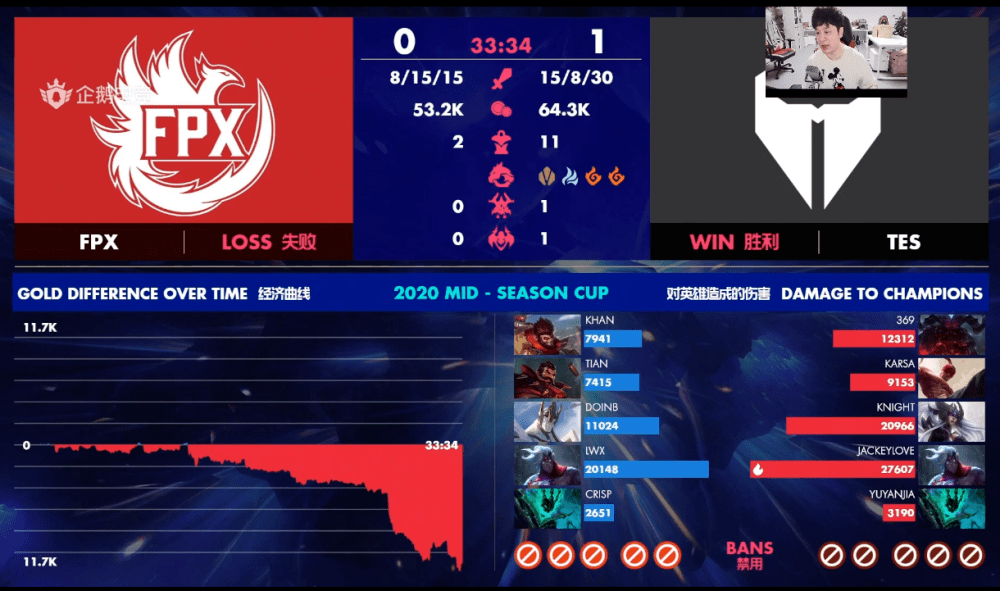 27分钟时TES利用中野优势选择大龙逼团,辛德拉孤身切入敌方后排,爆炸输出配合TES击杀FPX四人,并且拿到大龙buff后破掉FPX中路水晶。最终在33分钟时,TES破掉FPX三路水晶后轻松推平主基地,赢下第一局比赛。