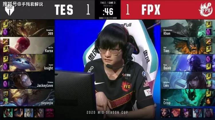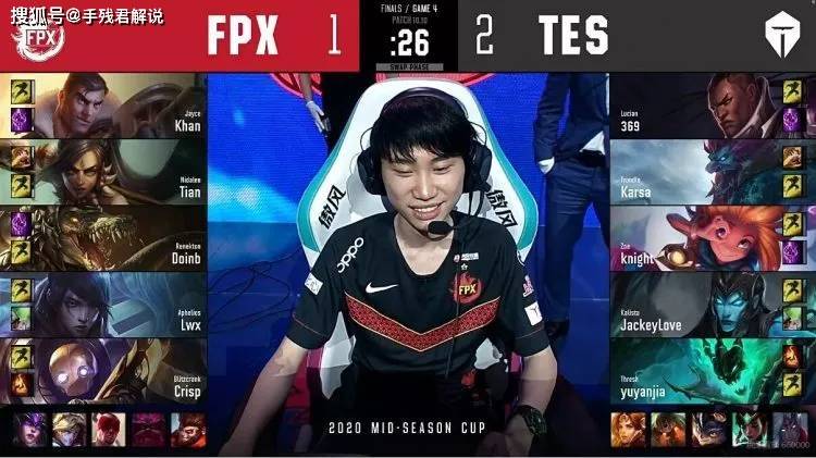 纵观这一把,手残君个人认为,打野小天的责任比较大,没有发挥出应该发挥的作用,具体来说就是没有小夫豹女的那个感觉,下路感觉发挥上比JKL和yuyanjia还是差一点。Doinb他已经做了他能做的全部,如果不说Doinb,可能FPX早就输了,Khan的话发挥中规中矩。可以看的除了Khan与FPX的契合度更好了,但是还没有达到巅峰,这里再感叹一下,JKL是真的叼啊,着融入的太快了,算起来JKL4月1日才加入TES,结果现在已经收获春季赛亚军和MSC冠军。