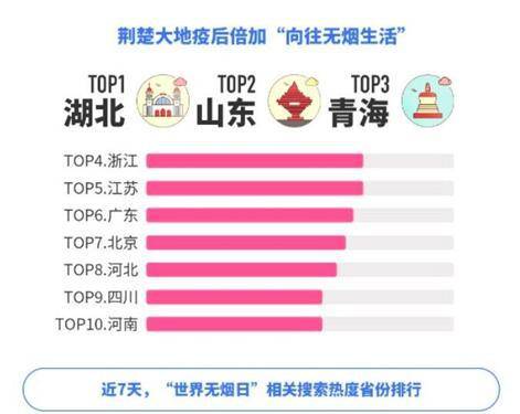 值得注意的是,作为本次疫情爆发的核心城市,武汉市民的疫后身体保护意识提升最为明显。百度搜索大数据显示,近7天,湖北人民对“世界无烟日”关注度达到近10年最高,并在全国省份排行中名列全国第一。在“世界无烟日”相关搜索热度城市排行中,武汉市排名第一,江城百姓成为拒绝烟草的“排头兵”。