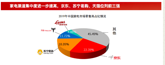基于国美与京东在家电采购方面的资源,双方联手势必会让家电零售格局“大变”,家电渠道集中在巨头手中。中国电子信息产业发展研究院发布的《2019年中国家电市场报告》(以下简称“报告”)显示,京东排在第一位占比达22.39%,苏宁与天猫紧随其后,分别占18.09%、11.72%,国美仅为4.88%排在了第四位。