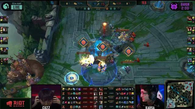 T1在拿到后期英雄,并且在前期拿到优势后,狂送,将优势拱手让人。顺便一提的是,他们的总分析师来自Splyce(欧洲蛇队)。