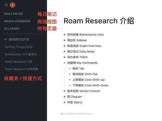 介绍完核心功能,回头再来看下 Roam Research 的界面布局。整个界面分为两栏,左边为菜单栏,只有简单的三项:‘每日笔记’、‘网络视图’以及‘所有页面’,外加下方的收藏夹。