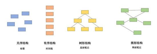 如果从数据结构的角度看,标签是无序结构,时间线是有序结构,层级笔记是树形结构,网状笔记是图形结构。从无序到有序,到树形,再到图形,结构的复杂度一步步增加。