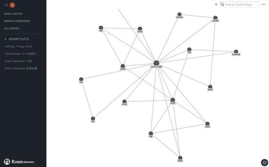 也许有人担心,这么复杂的知识库如何查看结构呢?不用怕,Roam Research 提供了全局的网络视图,将所有的笔记页面通过节点和连线关联到了一起,某一节点的连线越多,节点越大,让你清晰直观地了解整个知识库结构。
