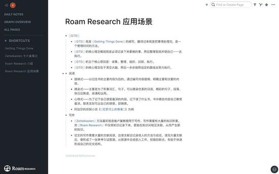 Zettelkasten 方法最初就是被卢曼教授用于写作,写作需要有大量的知识积累,而 Roam Research 不仅将知识记录下来,更能在知识间相互关联,从而产生新的知识。