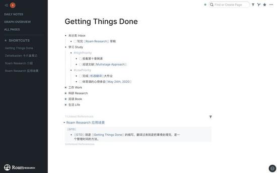 得益于 Roam Research 快捷的链接功能,在记录待办事项时可以轻松引用其它事项,或提及其他人,也可以使用 # 对任务的优先级进行分类。并且作为 GTD 的核心之一,对已完成事项进行回顾和反思也变得十分容易。