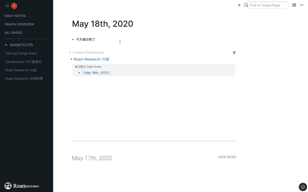 回到一开始的问题,当我们打开软件后,该在哪里新建笔记呢?Roam Research 为我们回答了这一问题,那就是每日笔记 Daily Notes。