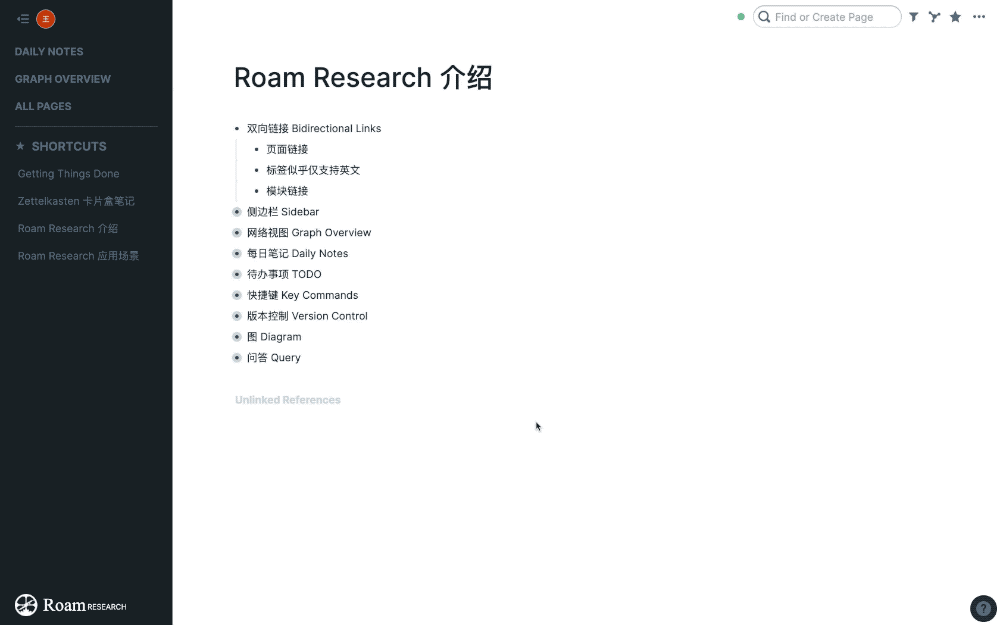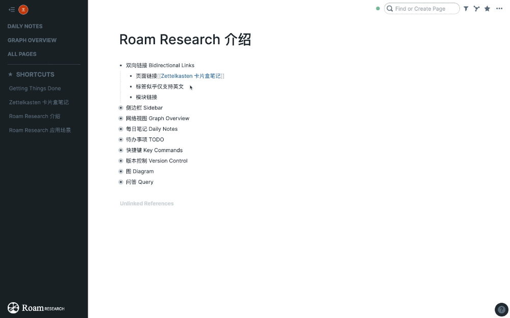 另外,即使没有添加链接,Roam Research 也会自动找出包含该关键字的页面,并且显示在末尾的‘未链接页面’中。这时候,如果想要添加关联,只需点击‘Link’即可。