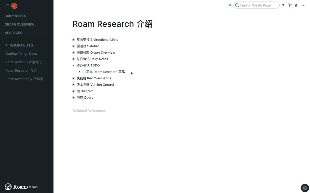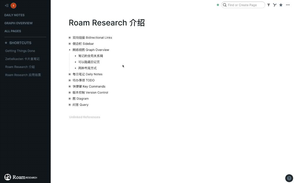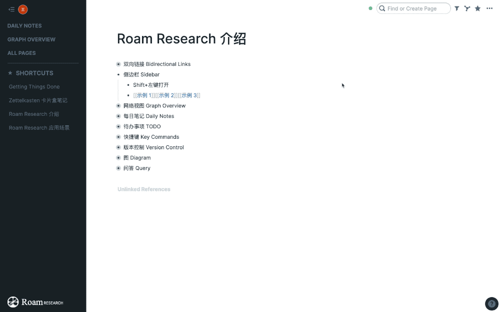 在 Roam Research 中,只要输入两个方括号 [[]] 并输入文字,就可以新建或引用一个页面。类似的,选中已有笔记,添加两个方括号,也可以将其升级为一个单独的页面。以这种方式呈现的页面称为‘参考页面’。