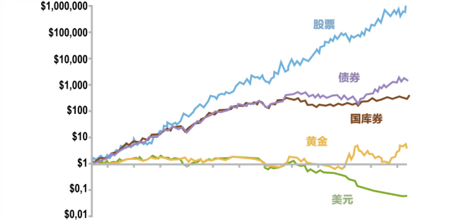 根据金融投资品的历史走势,股票类投资的收益在近200年中远远超过现金、债券、商品类的投资。