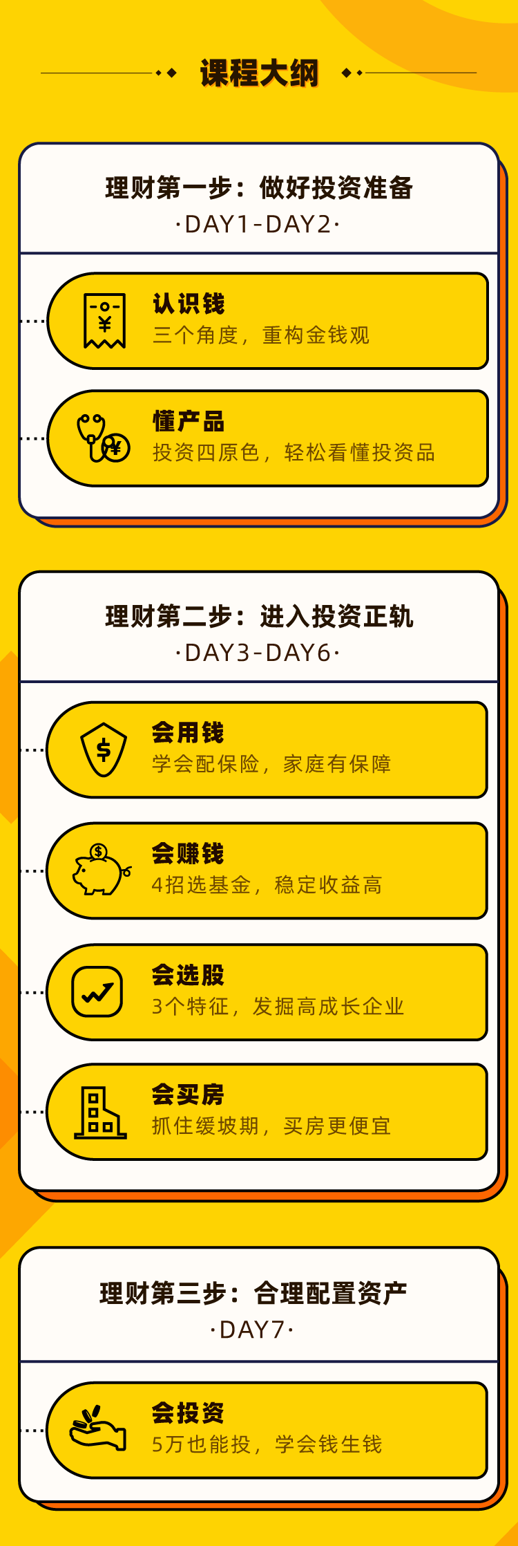 7天的课程覆盖重点五大常见投资方向,包括财务、保险、基金、房产、股票等,均由各行各业有十年以上资深经验的老师授课。