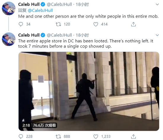 在华盛顿特区,一群人聚集在一家苹果商店里。视频中,店内的大门被强行打开,人们冲进店内进行洗劫,店内的东西都被洗劫一空。