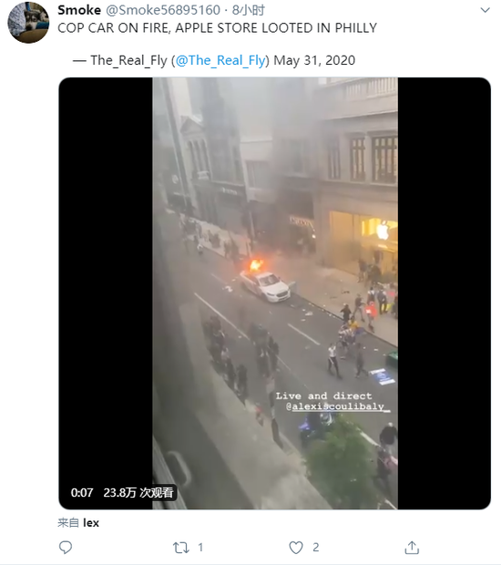 在费城,观察者们看到,在另一次抢劫行动中,有人进出了一家苹果商店。在店外,一辆警车起火。