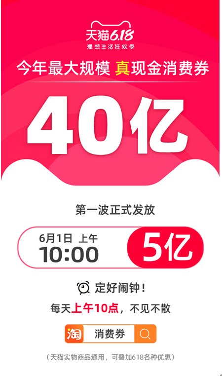 记得定今天早上10点的闹钟,上淘宝抢40亿天猫618现金消费券!