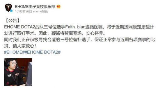[公告]EHOME DOTA2战队三号位选手Faith_bian遵循医嘱,将于近期按照原定康复计划进行取钉手术。因此,鞭酱将暂离赛场,安心将养。同时我们正在积极寻找合适的三号位替补选手,保证正常参与近期各项赛事的比拼。请大家放心!