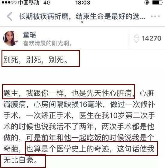 2015 年,就有一位患有先天性心脏病的女大学生,在知乎发了一篇题为《长期被疾病折磨,结束生命是最好的选择吗?》的帖子,表示自己无法忍受病痛折磨,想要放弃治疗。