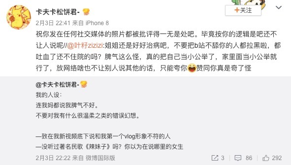 而卡夫卡松饼君也开始拉黑并人肉、挂出一些质疑她的网友,甚至有网友因为受不了粉丝的攻击而删掉了微博账号,这也成为了卡夫卡松饼君的另一个争议点。
