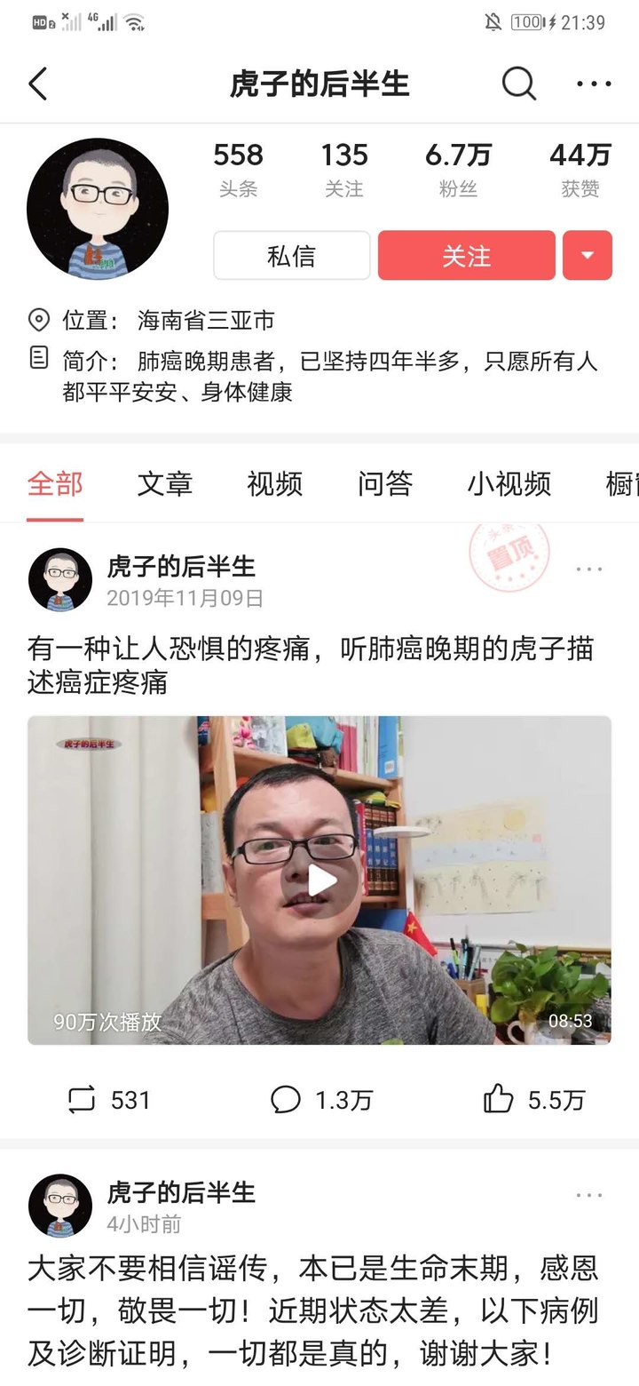 一个 36 岁的肺癌晚期患者,家里本就有一位百病缠身的父亲,刚刚得知母亲目前又因为脑中风住院,家里还欠着几十万外债。虎子彻底崩溃了,在视频中泣不成声。