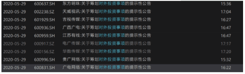 5月28日盘后,广电系上市公司纷纷披露“关于筹划对外投资事项的提示性公告”。