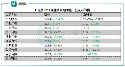 在快速发展的移动互联网时代,IPTV业务发展迅猛,对产品体系存短板的传统有线电视造成严重冲击。广电行业由于缺乏统一运营管理,研发能力不足,导致用户总量持续下降、APRU值降低、收入和利润下降。在2019年,10家广电系上市公司增长普遍出现乏力,其中仅有4家公司营收录得上涨,净利润增长的的公司也仅有2家,其余公司净利润下降幅度大多达到高双位数。
