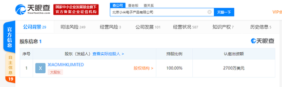 天眼查数据显示,北京小米电子产品有限公司成立于2012年1月,注册资本2700万美元,公司经营范围包括委托生产智能机顶盒、家用空调、智能电视、家用影视设备及电子产品;研究、开发计算机软件及信息技术;销售自行开发产品等,由XIAOMI HK LIMITED全资持股。
