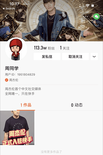 除了拿下周杰伦音乐的短视频版权,快手似乎还要“拿下”周杰伦本人。昨日,快手上就出现了名为“周同学”的账号,认证处写着周杰伦,并且是“周杰伦首个中文社交媒体,全网唯一,只在快手”。截至发稿之时,周杰伦在该账号已经发布了首个作品,他宣布自己正式入驻快手,并表示关注人数达到1000万时会给大家表演魔术直播并送出礼物,目前粉丝关注数已经达到了113万。(戳以下视频了解)