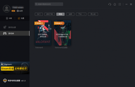 6月1日-6月3日奇游电竞加速器将会开放2个加速分区的限时免费加速:Valorant和Valorant注册。