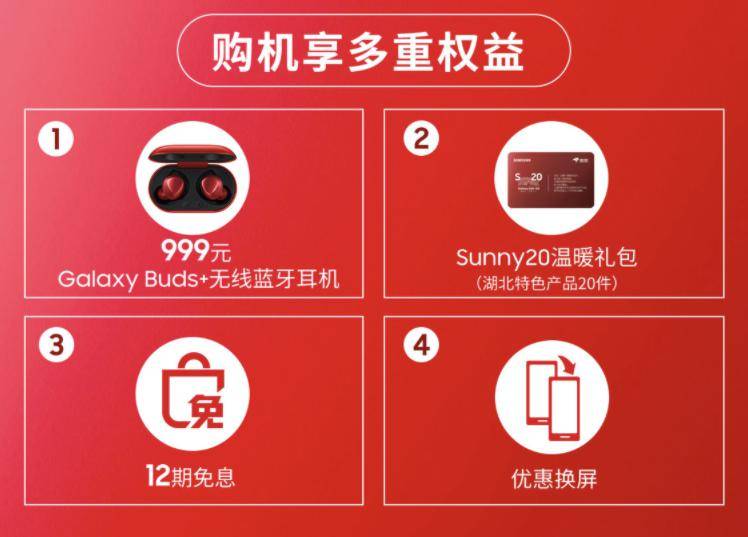自三星Galaxy S20 5G系列问世以来,其三款不同定位的机型便满足了众多消费者对于5G时代旗舰的期待,其中特别是三星Galaxy S20+ 5G更受到了用户的广泛好评。此次Galaxy S20+ 5G馥郁红的上市,不仅能够让更多消费者享受出众的产品体验,同时还带来了多重惊喜好礼,让消费者获得更多购机实惠。从即日起,凡在京东三星手机官方旗舰店购买三星Galaxy S20+ 5G馥郁红的消费者,即可获赠价值999元的限量版红色Galaxy Buds+无线蓝牙耳机,内含20件湖北特产的“Sunny20温暖礼包”,同时还可享受至高12期免息,以及包括优惠换屏服务、电池性能检测及优化、5折电池更换服务、VIP专属热线在内的专属管家服务。
