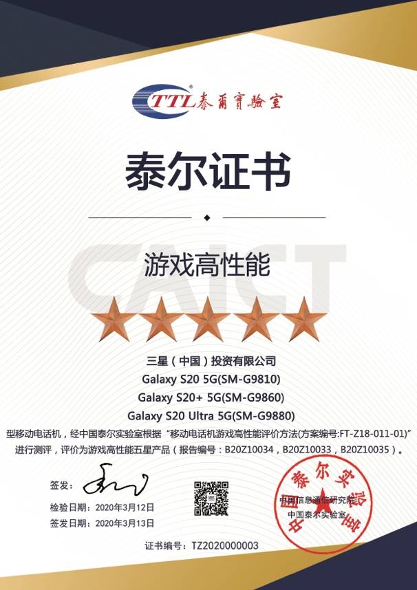 在三星Galaxy S20+ 5G馥郁红独特的外观气质之下,包裹着三星一如以往的顶级科技及体验。其搭载了6.7英寸的超感官全视屏,支持时下“当红”的120Hz屏幕刷新率和240Hz的触控采样率,能够为用户带来了流畅的视觉体验和爽滑的触控体验。再配合骁龙865处理器、12GB的LPDDR5运行内存和4500mAh大容量电池的强劲配置,令其获得了泰尔实验室“游戏高性能五星认证”,让喜爱手游的用户仿佛拥有了一位能够“肆意”驰骋游戏世界的强力伙伴。