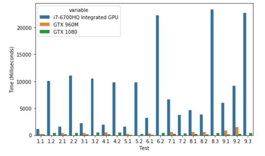 第一个结果是针对单个测试及其运行时间的(以毫秒为单位)。我只展示了19个测试中的1到9个,结果太多怕看不过来。我的GTX 960M GPU(XPS配的GPU)测试过程中遇到了一个大问题。因为它GPU只有2GB,结果训练张量太大放不下,所以在很多项测试中都无结果。