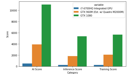 测试完成后,AI-benchmark还会创建一个总体评分(越高越好)。注意,GTX 960M基准分是推断出来的因为某些测试无法完成,因此没办法获得总分。因此,我根据类似的GPU的AI-Benchmark的测试结果推断了一个分数。