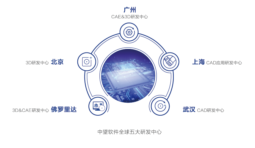 中望软件深知,CAx软件核心技术研发与创新,需要依靠世界一流的专业人才才能取得突破,也只有这样持续大力度的投入才有追赶国外技术的希望。为此,中望软件已建立有广州、武汉、北京、上海、美国佛罗里达五大研发中心,汇聚了200多名国内外顶尖的CAx技术人才,专注于CAD、CAE、CAM核心技术的研发与攻关。其中,美国研发中心是一支以博士为主体、平均拥有近30年3D开发经验的资深专家团队,在造型几何、混合建模、5轴加工等众多高精尖技术项目上拥有自己的独到优势,达到世界领先水平。