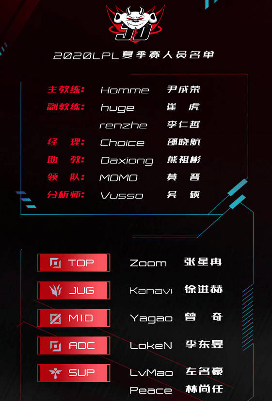 然后轮到JDG战队。JDG战队的阵容也没什么变化,和春季赛相比,只是少了一个705,705都加盟RNG了。其实JDG的实力还不错,春季赛拿到了冠军,但在季中杯的时候状态不太好,导致四强就出局了。他们这个阵容,冲击S10还是挺稳的,但冲击世界冠军的话,就要看他们的状态够不够猛了。