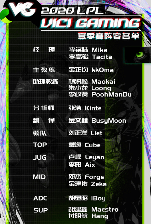 最后官宣的是VG战队,VG战队的阵容相比之前有不少的变化,首先龙哥这位VG名宿回来VG执教了,然后上单位置上,替补上单zdz被下放到二队,打野位置多了一个小乐言,小酋长走了,其他位没有变化,iboy依旧没有替补。在小酋长走了之后,VG就剩下zeka一位韩国选手了,而在zeka交流问题没解决掉的情况下,应该都是蕉太狼首发,VG大多时候都算是全华班吧。