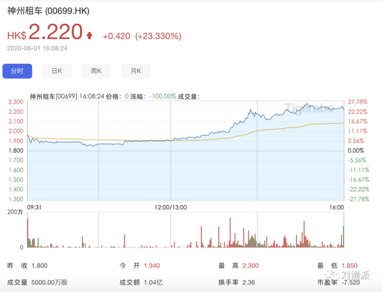 这一消息披露,市场也给出了正向反馈:截止今日收盘,神州租车股价大涨23.3%,市值提升8个亿。