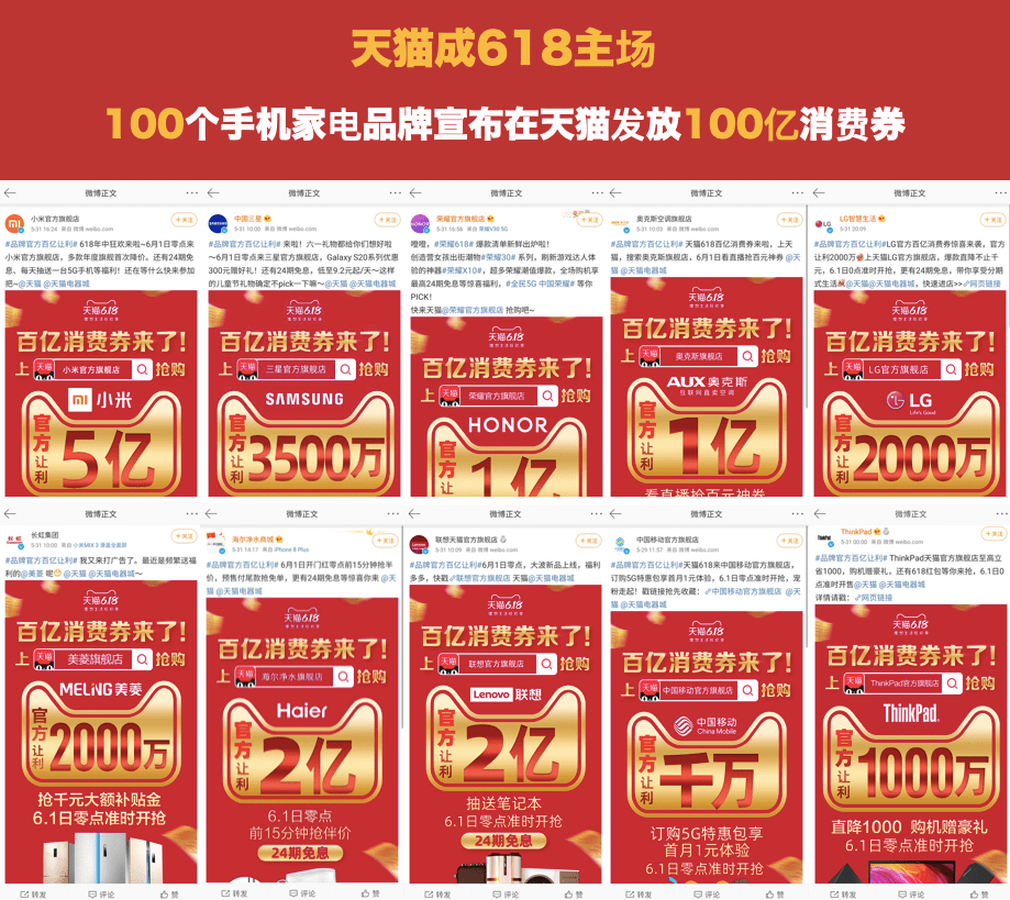 小米、荣耀、海尔、奥克斯等100家手机家电品牌在官微宣布:通过天猫再发放超100亿消费券。